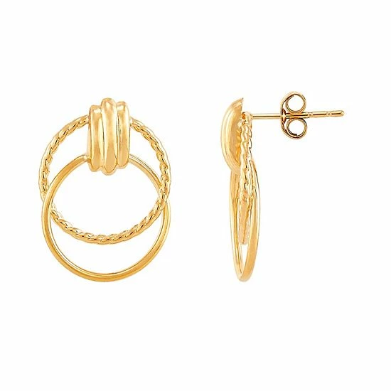 Featuring pairs of polished and twisted hoops crafted from 14k gold, these Everlasting Gold double circle drop earrings are a eye-catching finishing touch for your favorite outfits.