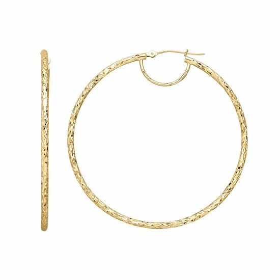 Add a hint of glamorous elegance to your ensemble with these Everlasting Gold 14k gold textured hoop earrings.