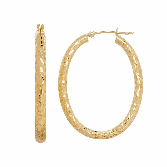 Textured accents give these 14k gold oval hoop earrings a glittery glow.