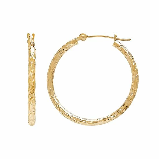 Decorated with diamond-cut details, these 14k gold tube hoop earrings shine from every angle.