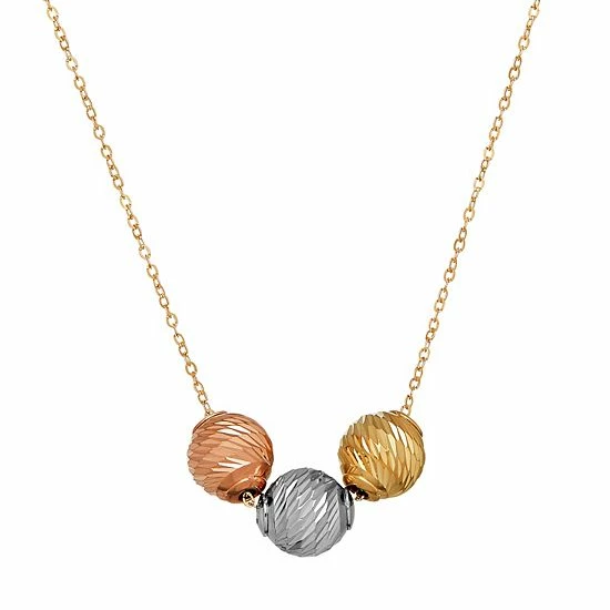 Adorned with textured beads in 10k yellow, white and rose gold, this 3-bead necklace is simple, yet stylish.