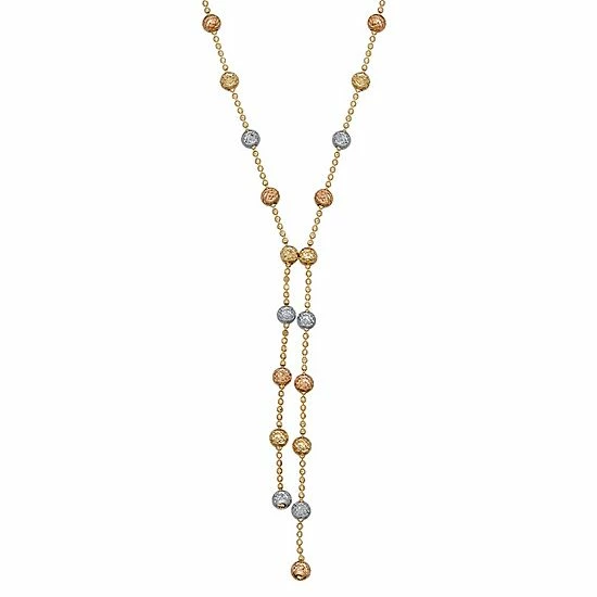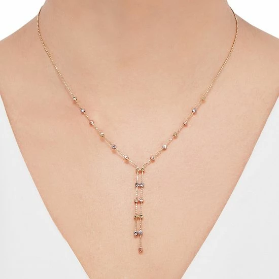 A fashionable look is easy when you pair this lariat-inspired tri-tone necklace with your favorite ensembles.